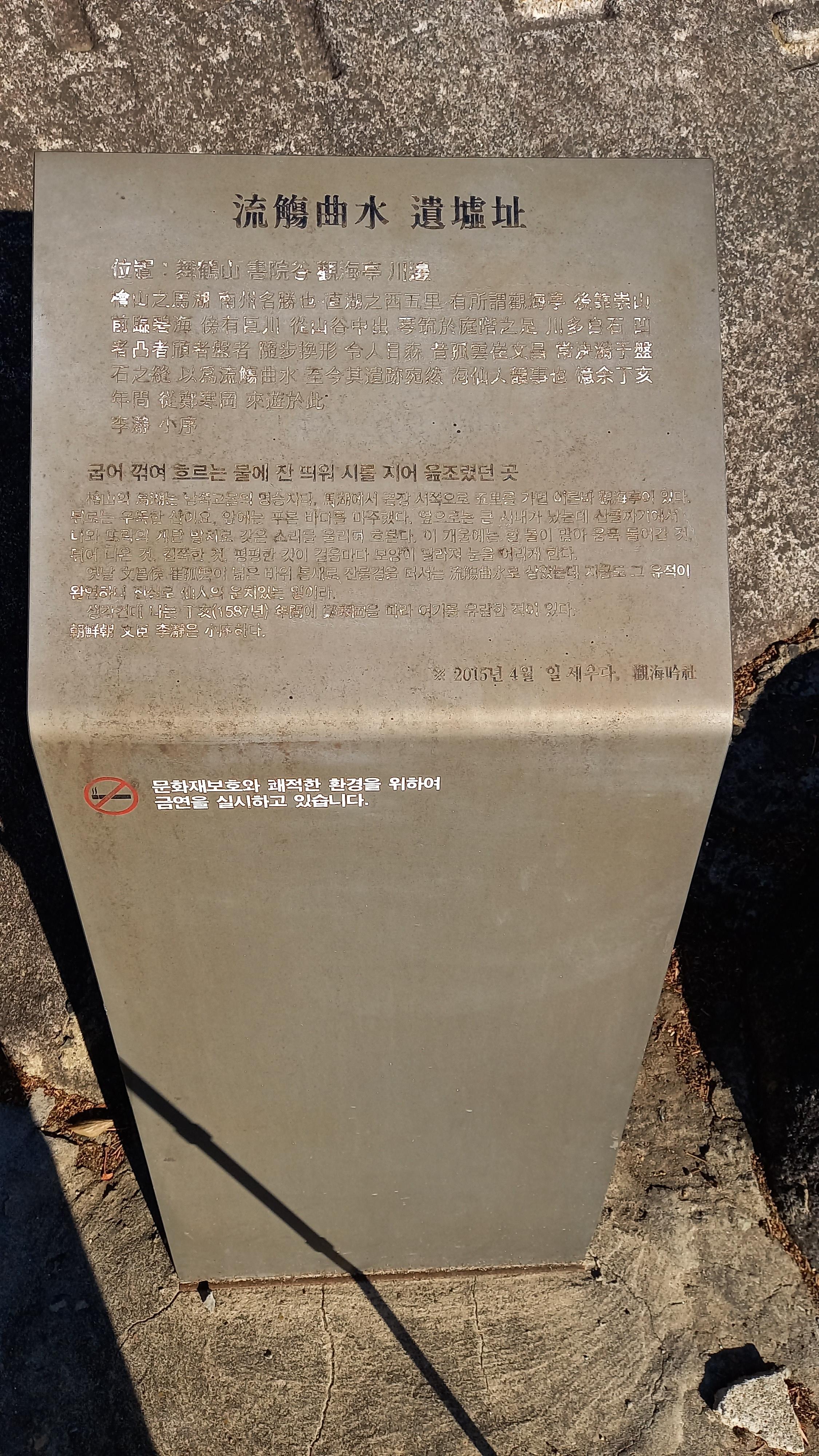 관해정앞 유상곡수 안내판 이미 하얀 페인트 벗겨져