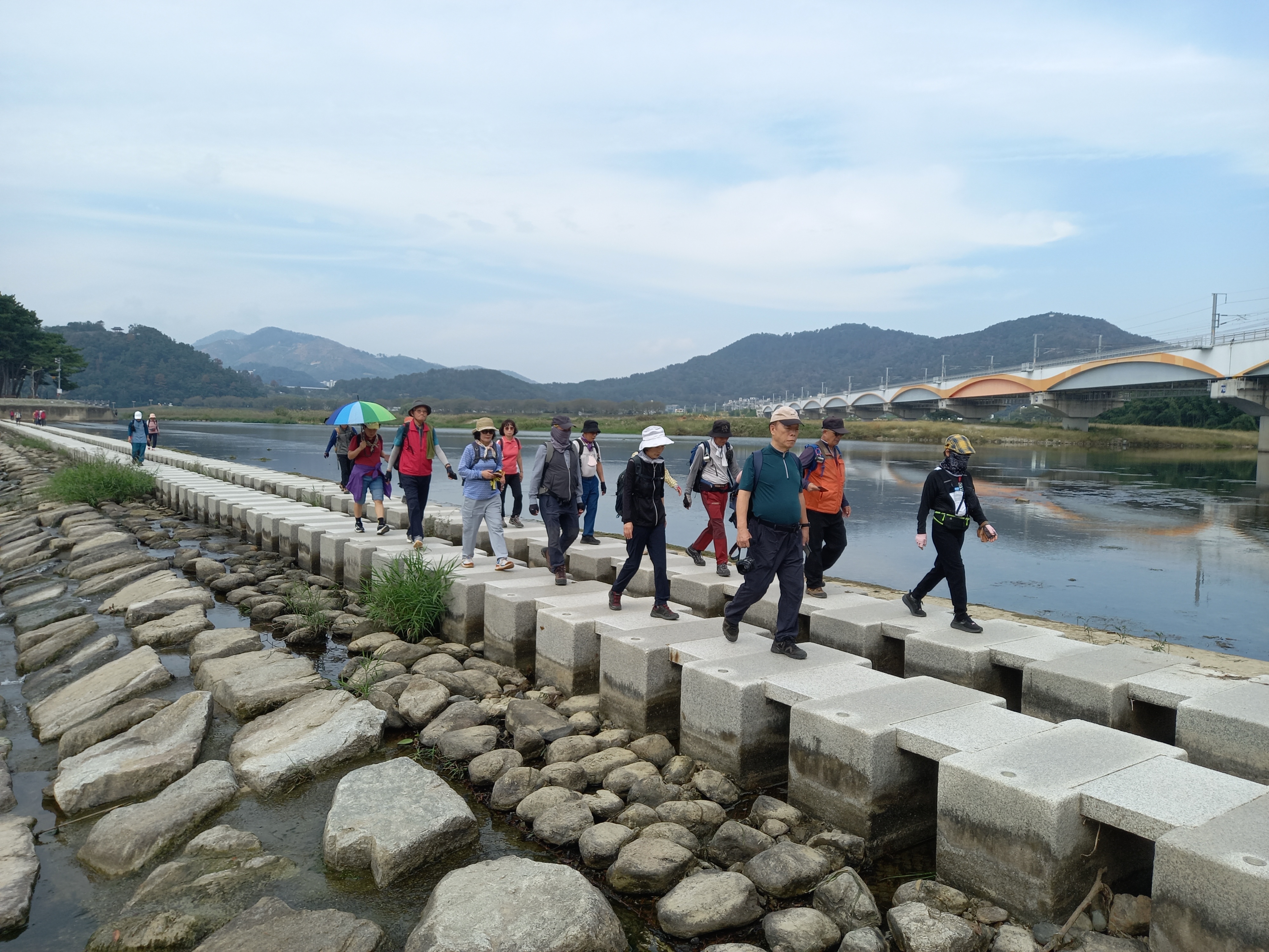 | 25.10.2 기차 타고 밀양 아리랑길 금시당길 왕복 걷다/264 코스 : 마산역(08:30)-밀량역(09 :50) - 국민체조-강변고수부지길-신 용두교-잔도길-지그재그데크길-달팽이전망대-능선길-금시당고개 삼거리- 하산길- 금시당주변평상(점심식사)-금시달 백곡재 관람, 촬영, 은행나무, 백송, 여주이씨 이광진선생 별서-강변오솔길-무암-잔도길-밀양강석교징검다리-송림공원-밀양강석교 반환-가곡동 관통로-밀양역(15:31)-마산역(17:00) 거리 시간 인원 : 24,630보, 20km, 8.5시간, 길사랑 28명 특색 : 모처럼 만에 밀양최고 명품길 일자봉 등산로와 금시당 밀양강변 오솔길 걷고 새로 신설된 특색로는 1. 용두봉 아래 밀양강을 건너는 용두교 신설 , 2. 천경사아래 절벽길 뚫어 잔도 데크길 건설 3. 산성산으로 오르는 첫 능선고갯길 지그재그 데크교 건설 및 달팽이전망대 건설 4. 능선길 야자매트로 깔아 놓은 길, 금시당 마당에 잔디밭 조성중 금시당의 유래와 시설 과 보호수 내가 해설했음 밀양강 속교를 건너서 송림숲 거닐고 밀양역에서 이상술 님의 얼음과자와 밀양역 추석승객을 위한 떡과 음료수 선물 나누어줌 기차 여행과 걷기 수련이 매우 평안한 걷기였음 |