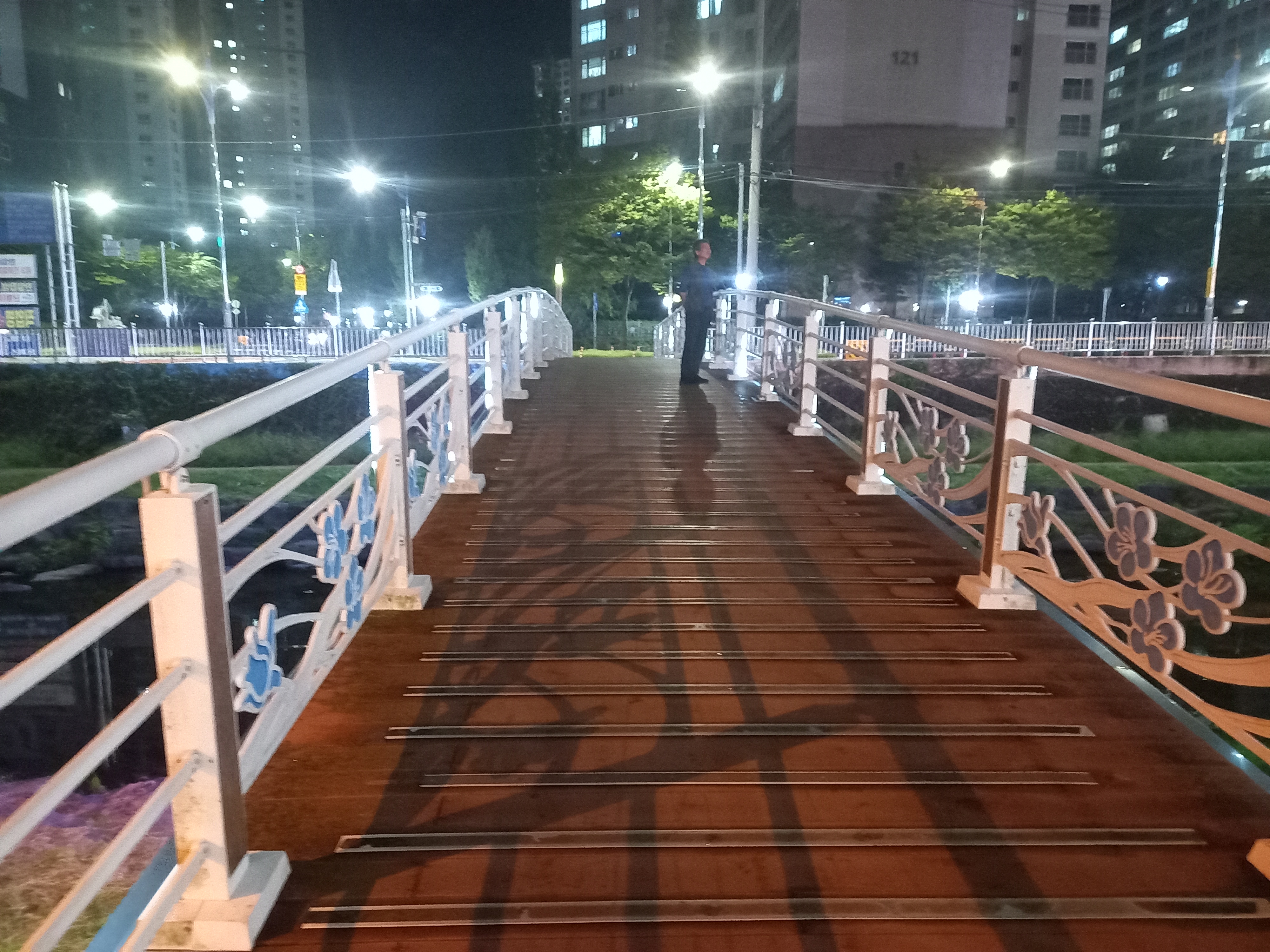 뿌우연 불빛이 내려앉은 산호천변 데크길