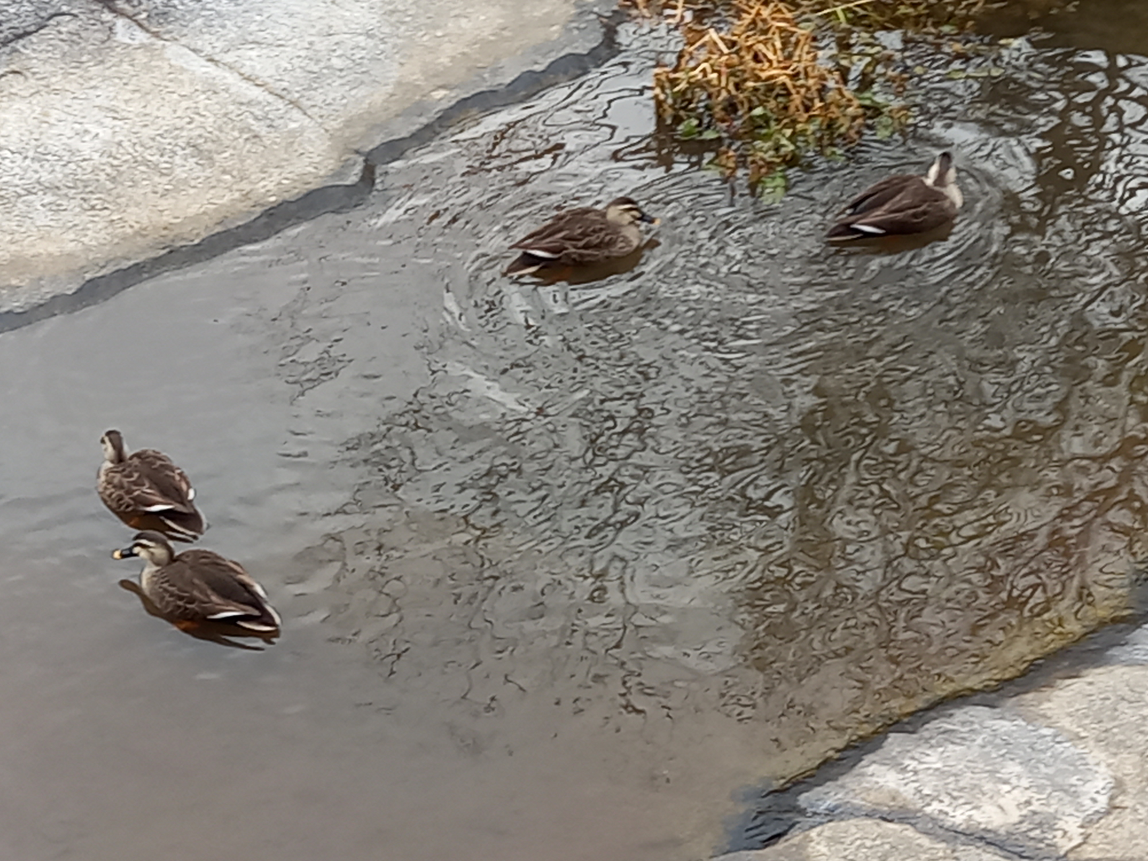 바위 반석에 갇힌 물에 뱅뱅돌며 이야기 재잘대는 오리들