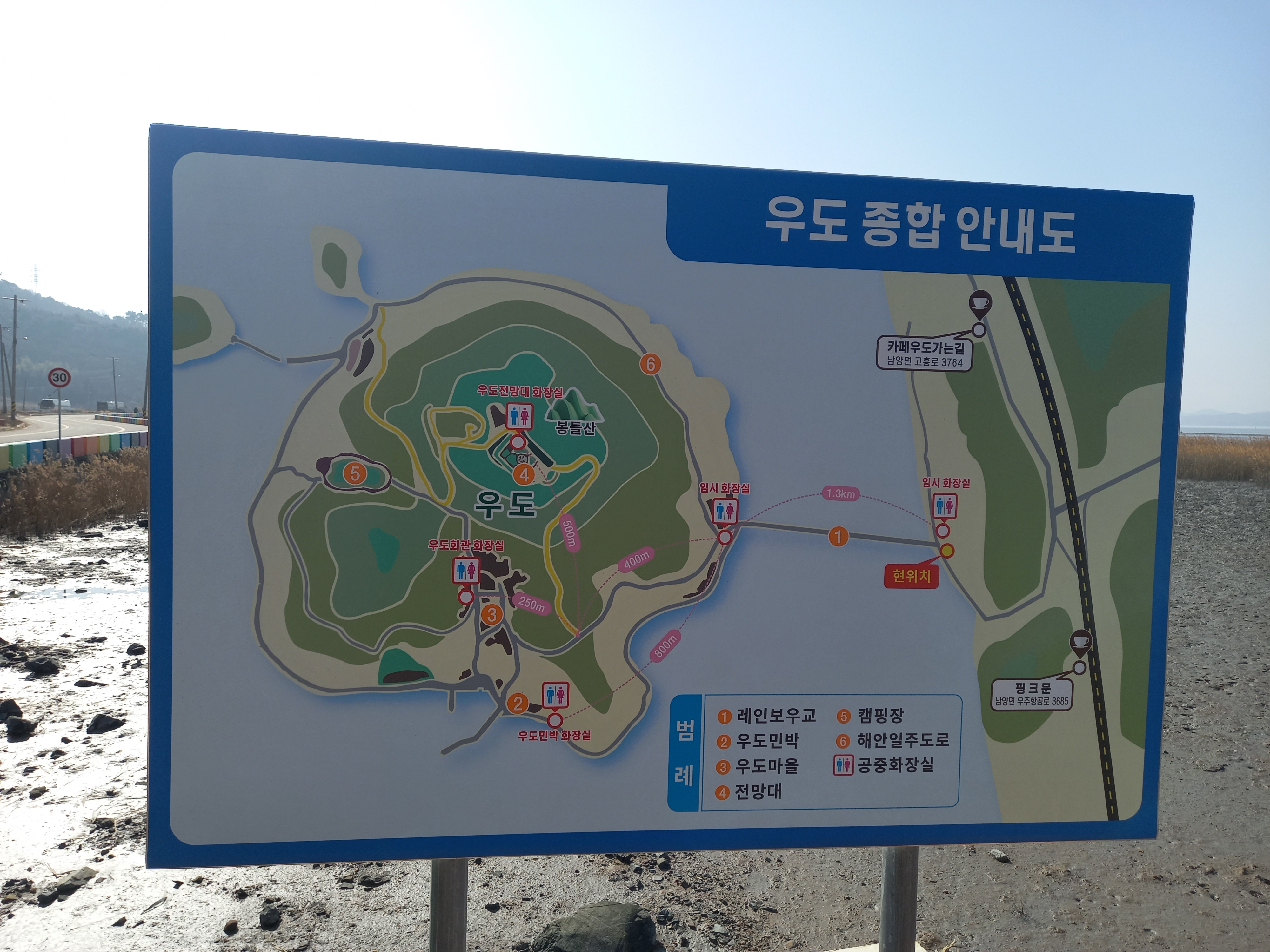 남양면 바닷가로 내려가니 우도 무지개길 바다에 꽂혀 있다.