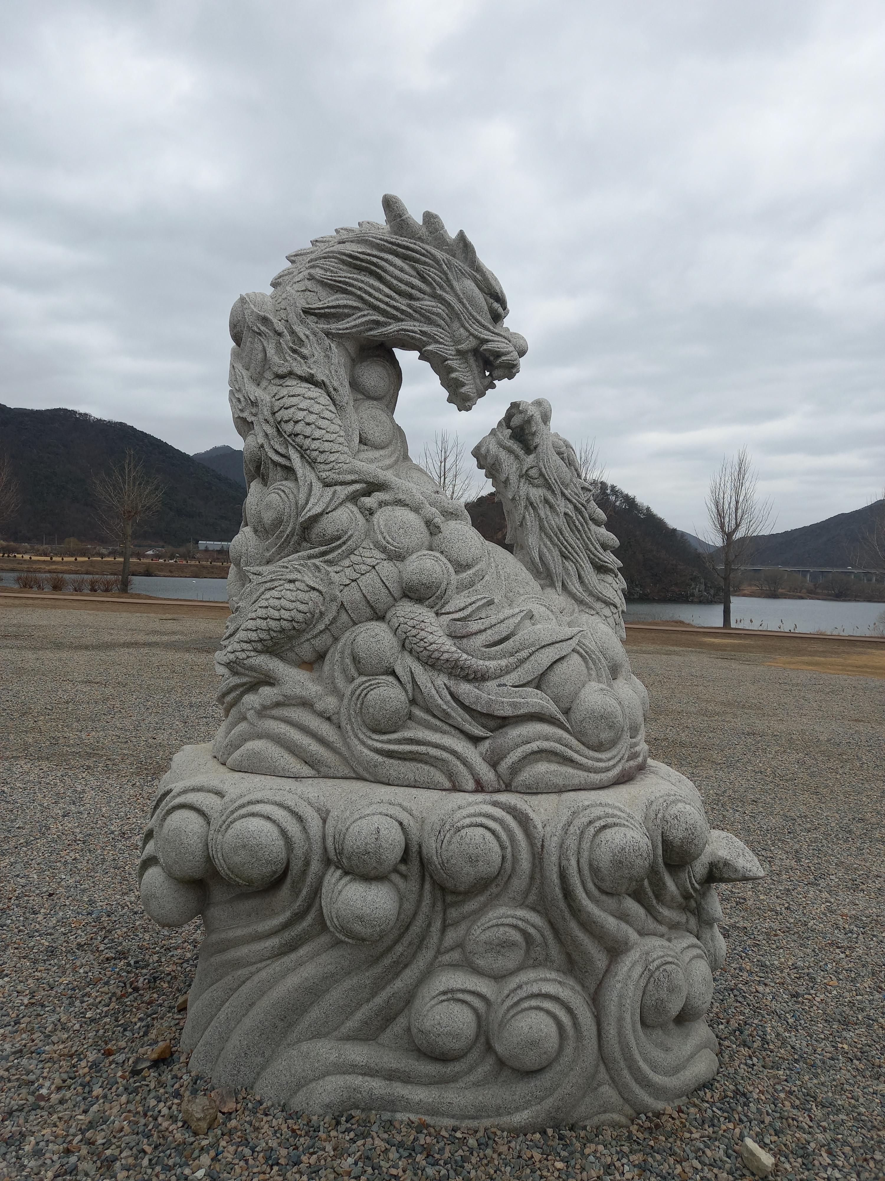 용신제회관 앞에 두마리 용 상하 눈부라린 형세